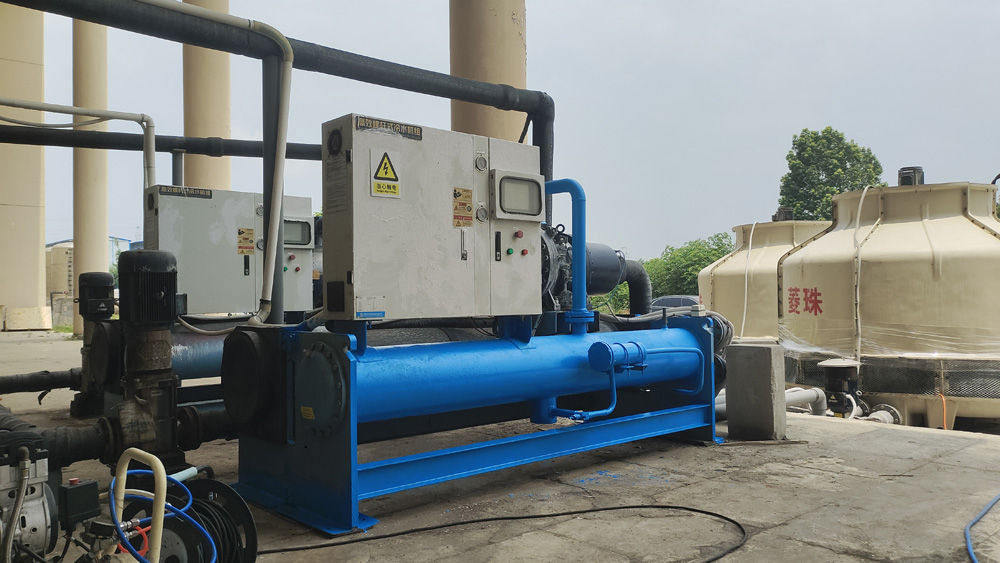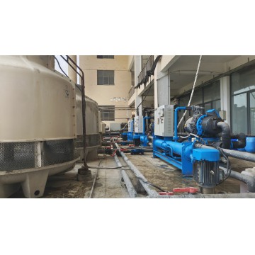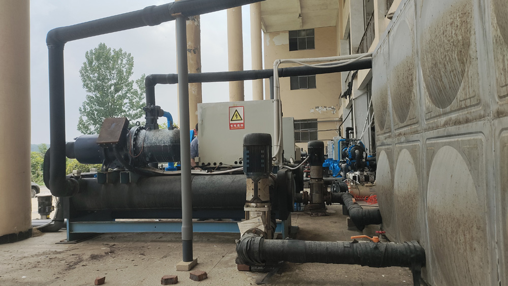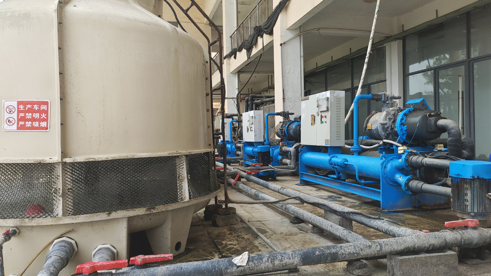 5臺80P螺桿冷水機對1個10噸的保溫水箱恒溫,使水箱24小時保持在18.5度,10臺不銹鋼水泵對車間10條鉆石培肓生產恒溫恒壓供水。